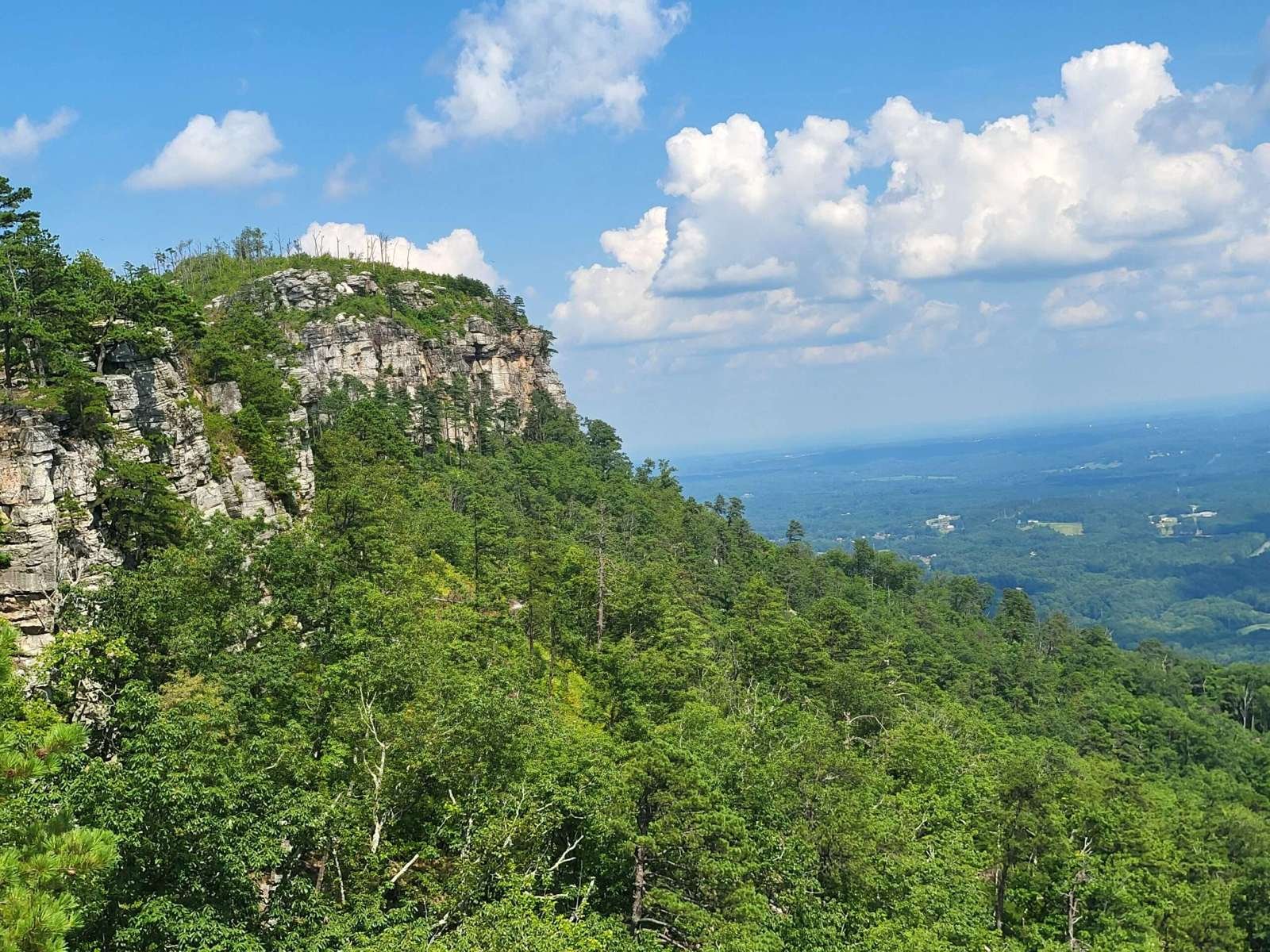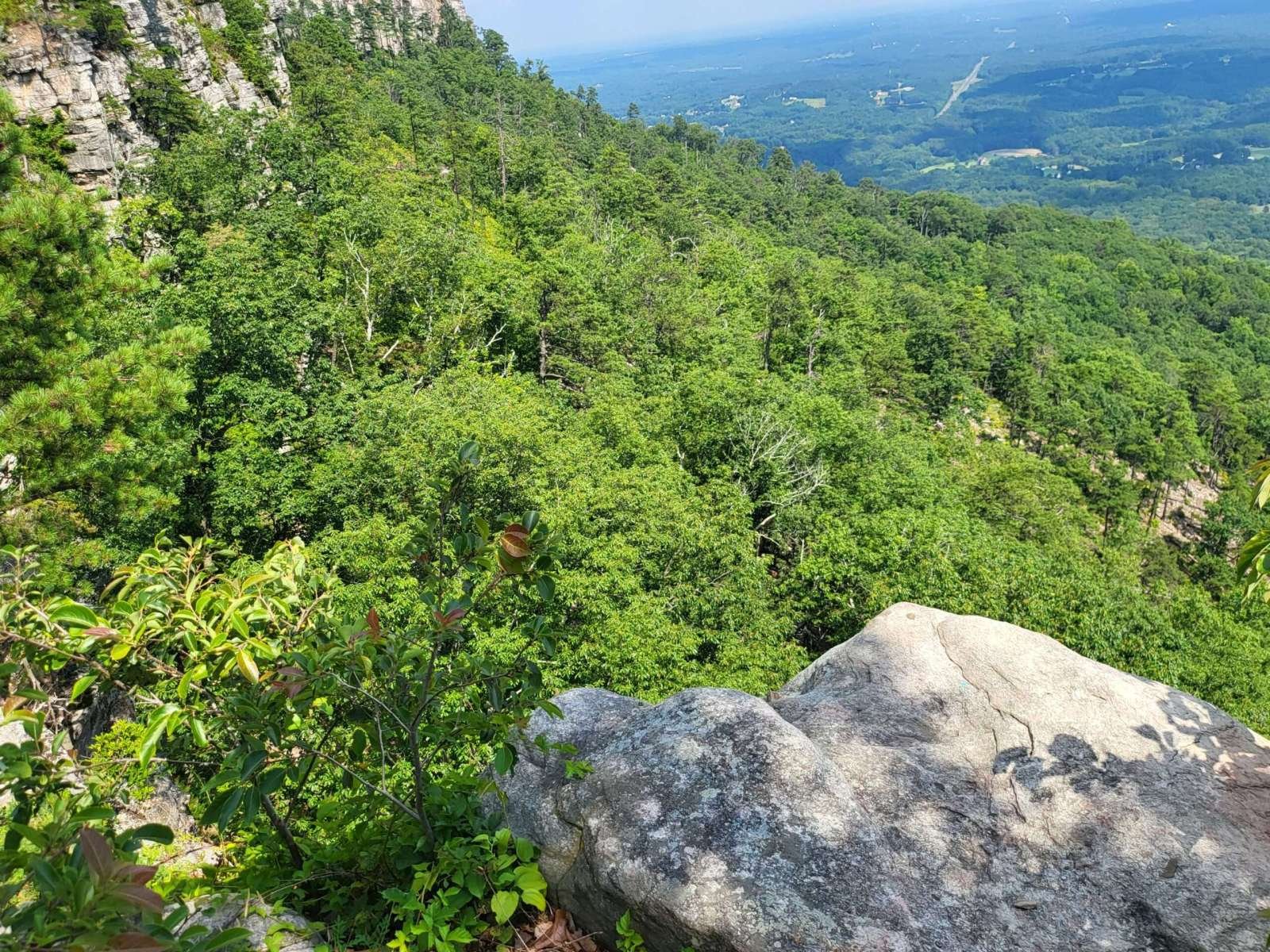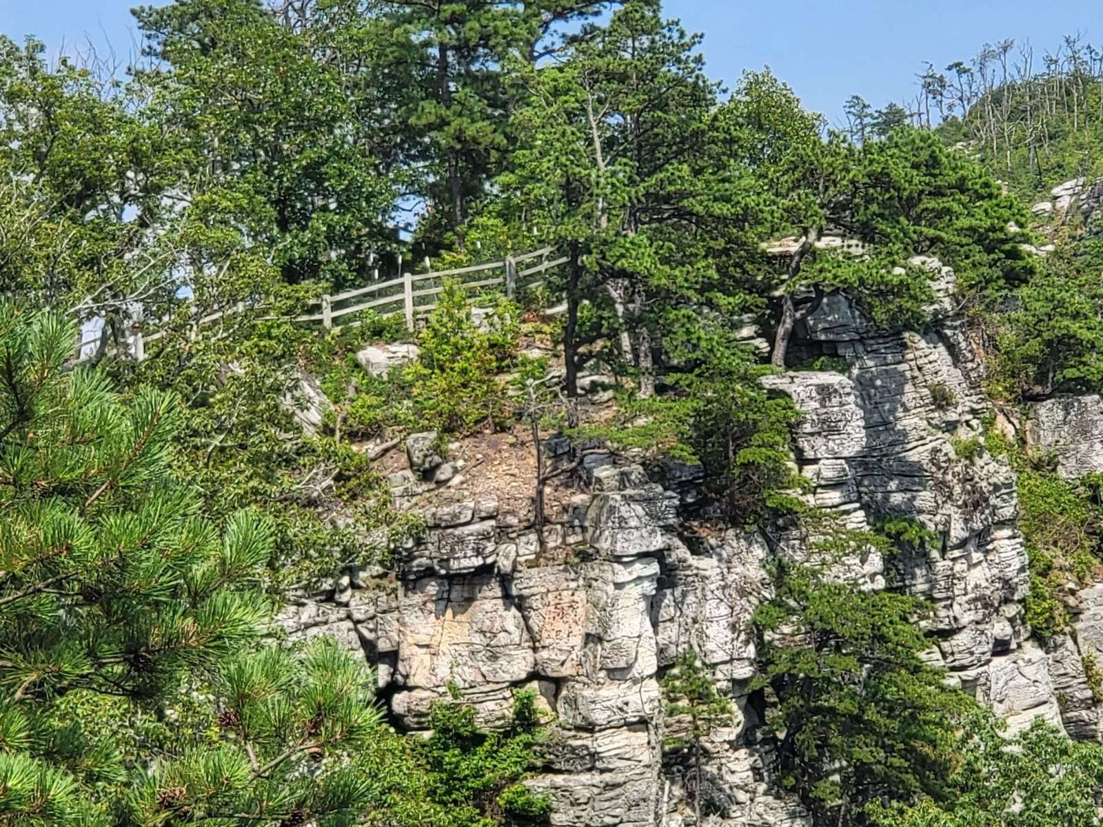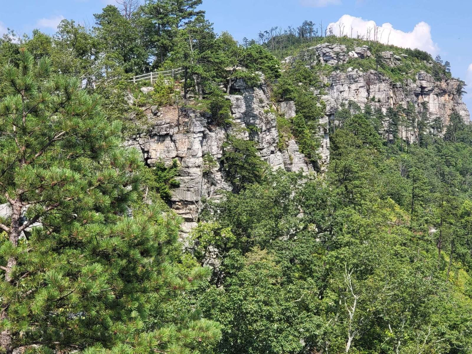 The drive up was steep and winding, with tight curves and descending traffic that made for a white-knuckle ascent. But the payoff? A short walk to the Little Pinnacle Overlook, where sweeping views of the Piedmont and Blue Ridge foothills stretched for miles. The knob of Big Pinnacle, capped in greenery and framed by sheer rock, stood like a sentinel over the valley.