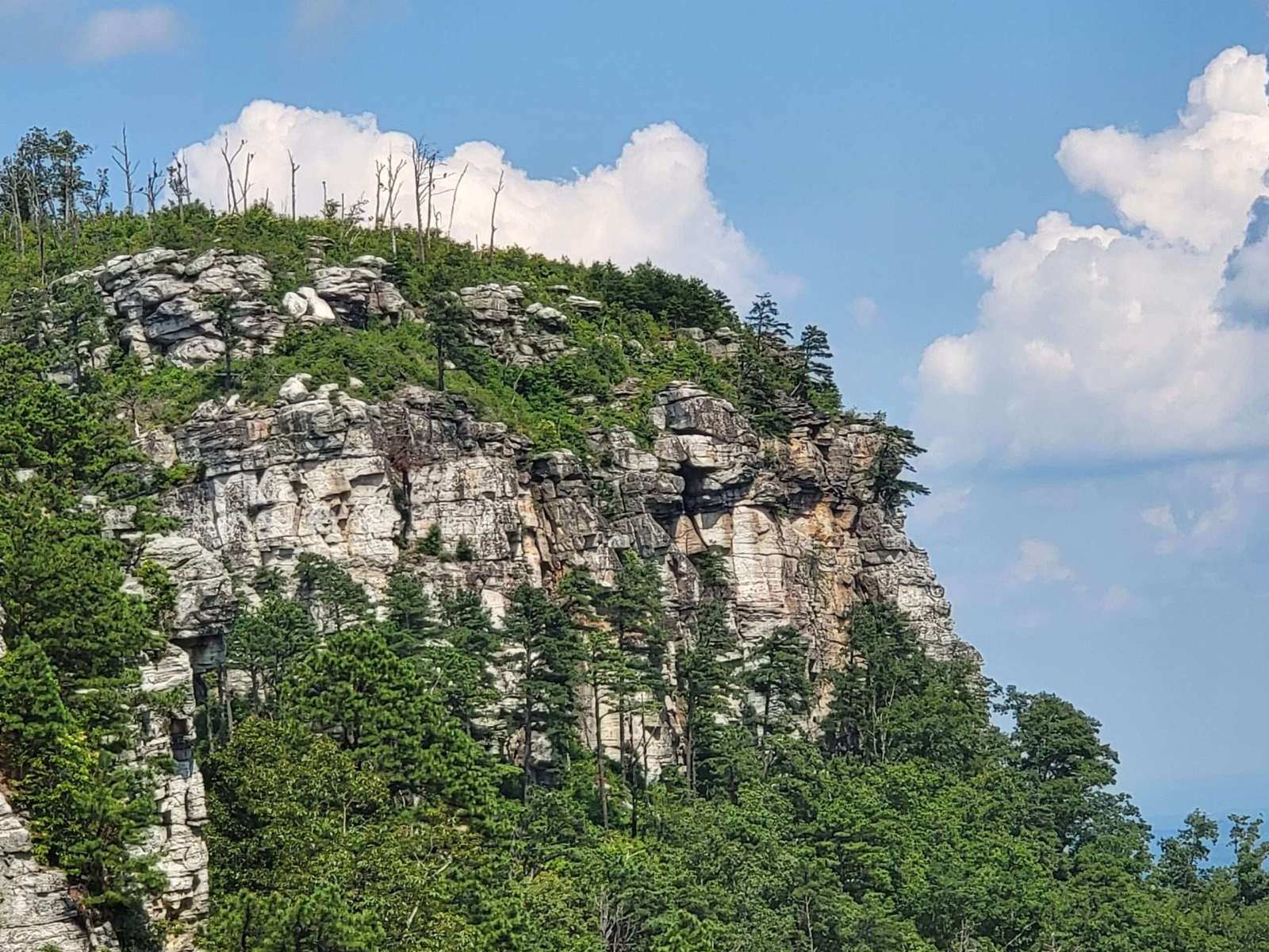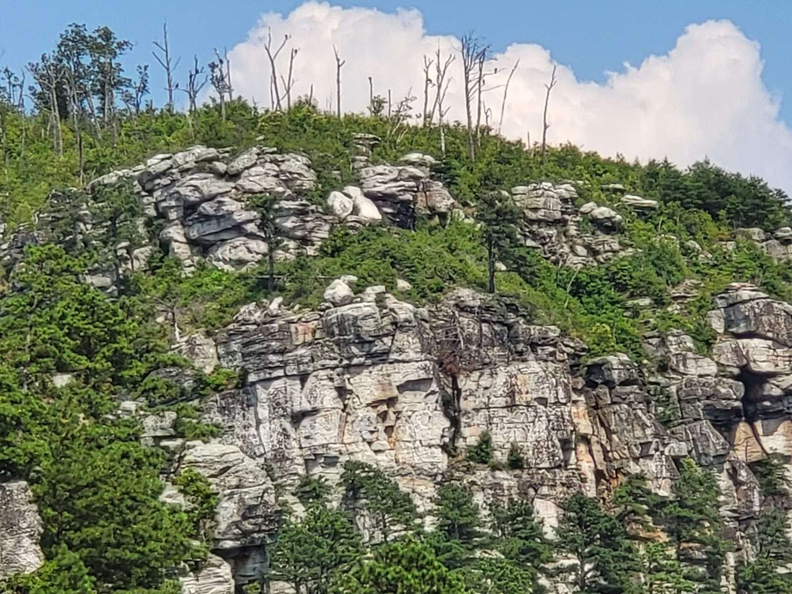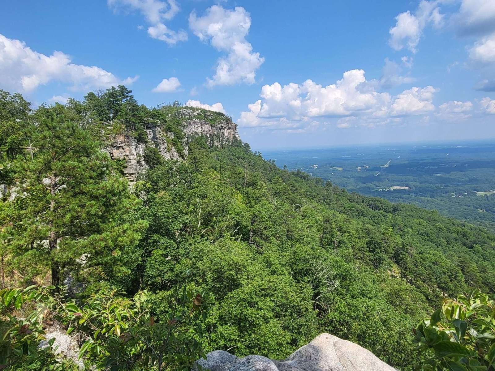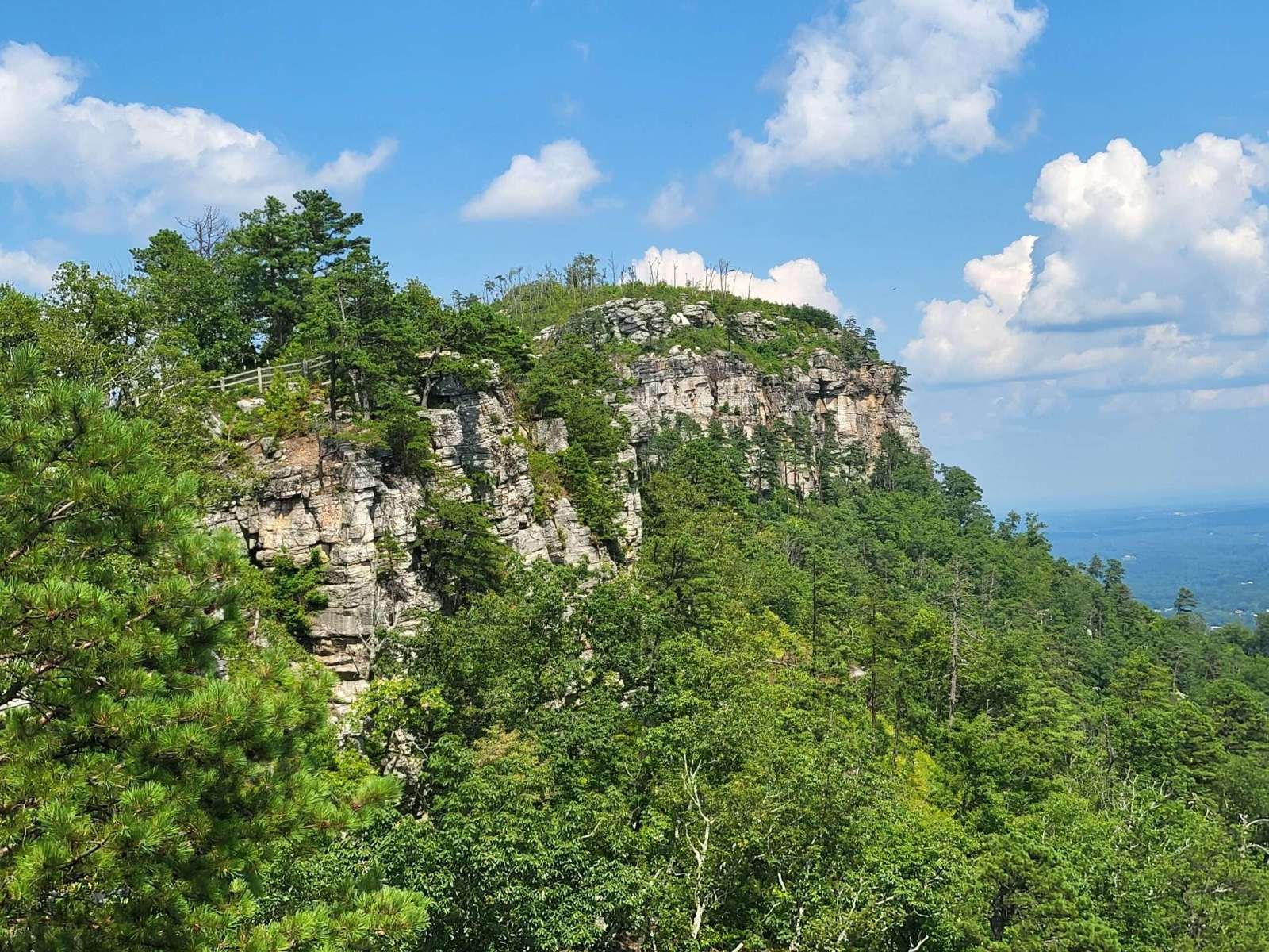 The drive up was steep and winding, with tight curves and descending traffic that made for a white-knuckle ascent. But the payoff? A short walk to the Little Pinnacle Overlook, where sweeping views of the Piedmont and Blue Ridge foothills stretched for miles. The knob of Big Pinnacle, capped in greenery and framed by sheer rock, stood like a sentinel over the valley.